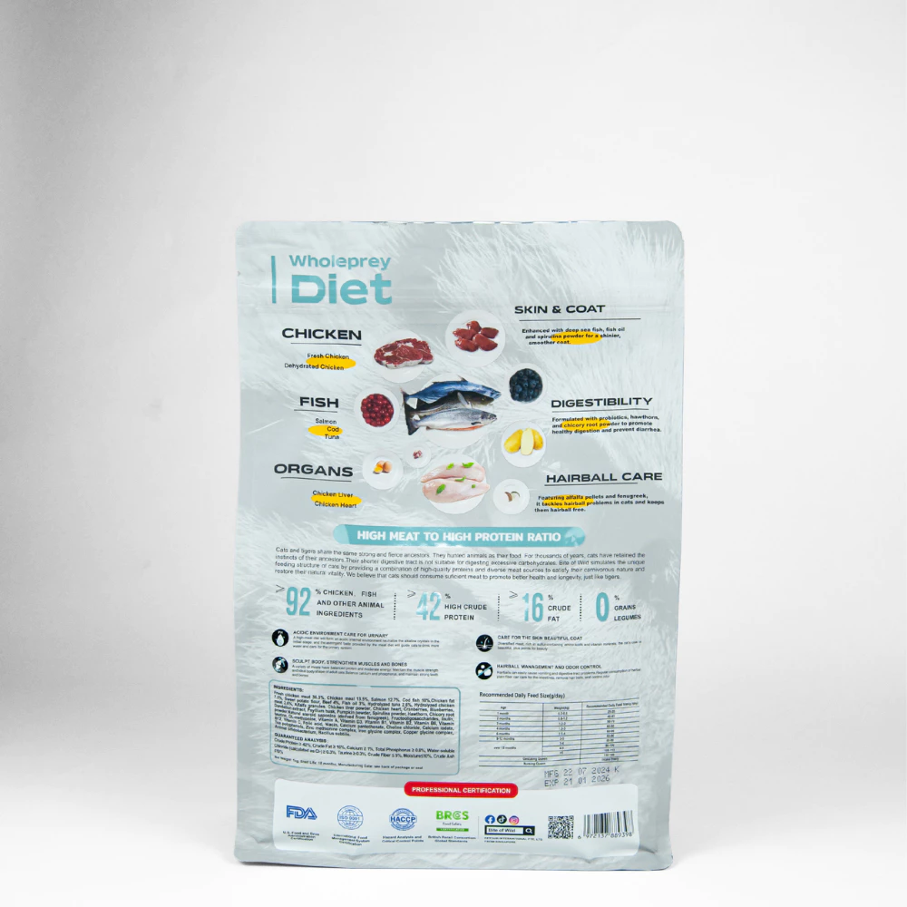 – Hàm lượng thịt cao: 92% thịt gà, các viên Cá Hồi, 42% protein, 1kg thành phần từ thịt động vật