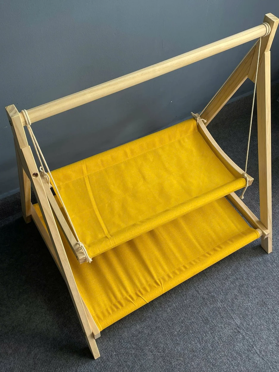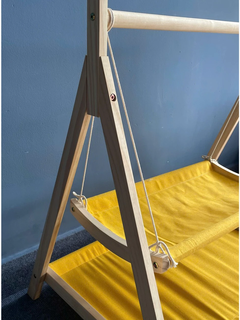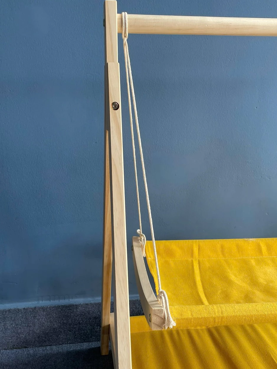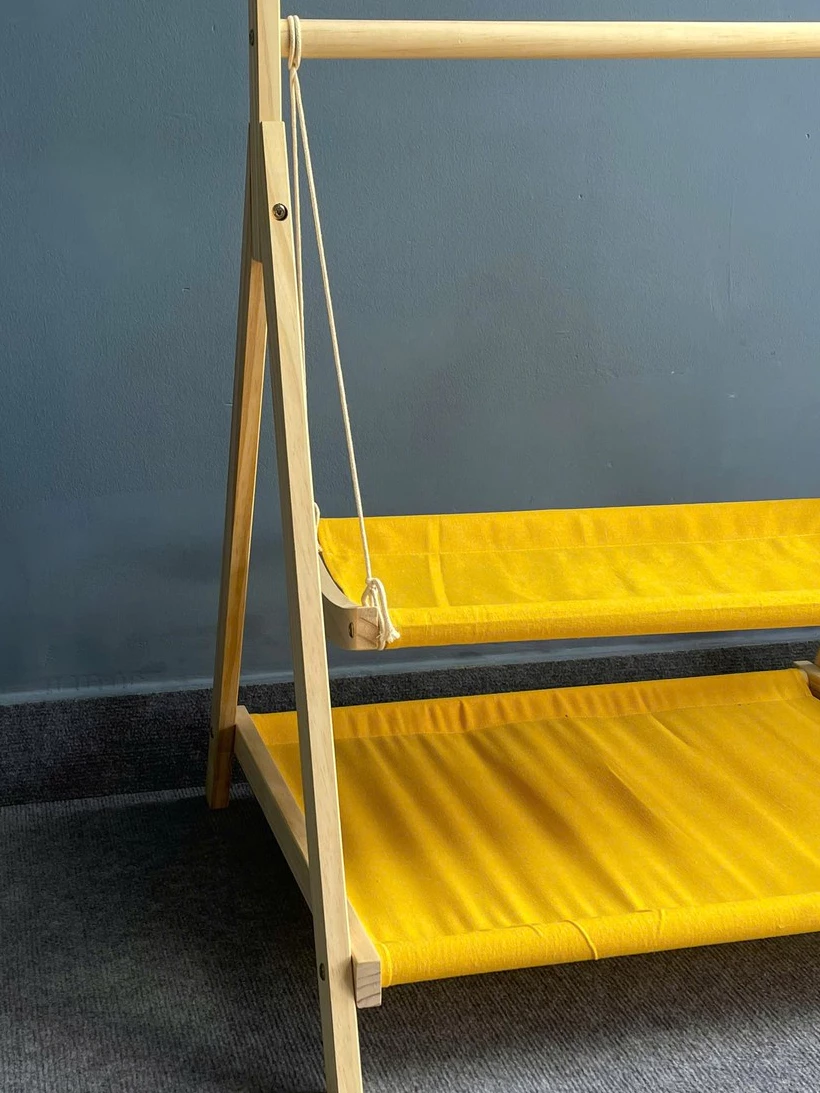 Tên sản phẩm: Giường xích đu hai tầng gỗ nguyên khối tích hợp treo quần áo – xích đu cho thú cưng dễ dàng tháo lắp và làm sạch.